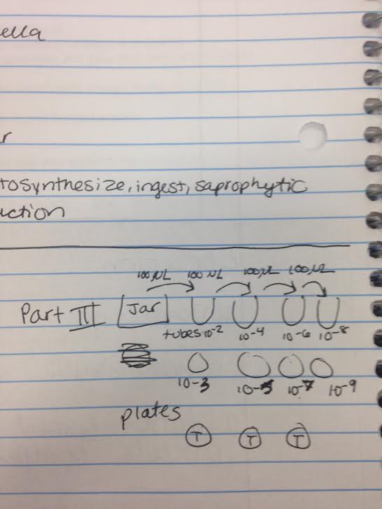 Additionally, we had to prepare a serial dilution of the hay infusion culture for Lab 3. Here is a drawing of the procedure, with the jar representing the original hay infusion culture and each successive tube moving towards the right representing a more diluted sample of the culture. The first three solutions were applied to regular agar plates and agar plus tetracycline plates; the fourth dilution was only applied to a regular agar plate.