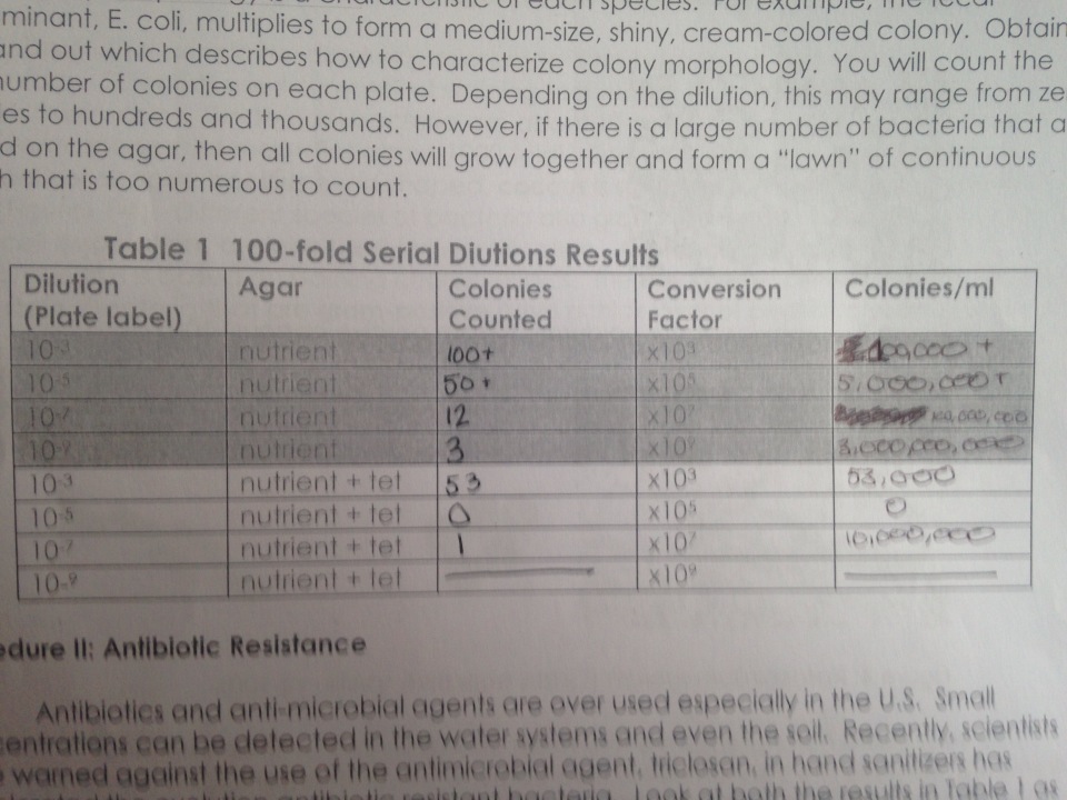 These predictions are based on the diluted agar nutrient and T-treated plates made last week in lab. We predict that the least diluted agar plates that are not T-treated will have the most colonies. We also predict that each nutrient agar plate will have more colonies that its T-treated counterpart of the same dilution.