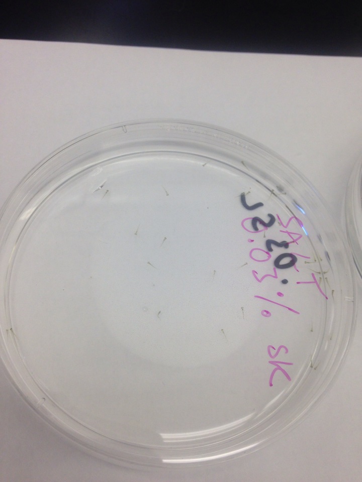 The length measurements from day 7 indicates little change in the growth of the fish of the control, .03%, and .3% samples; while the .03% sample had a shorter body than the control sample, the control sample and the .3% sample had the same body length, and all three samples had relatively equal eye diameters. Given the relatively low salinity, I determine that while low levels of salinity may affect brain development or basic bodily functions, it does not affect the growth in terms of what stage of development the fish may reach due to cell division and mitosis. However, the halving of the 3.0% sample's body length indicates that major levels of salinity - 3% in this case, which approaches the 4% level from Sawant, Yang, and Li's experiment - do affect cell division and not only prevent growth, but certainly lead to death, as by day 4 all of the larvae were dead.