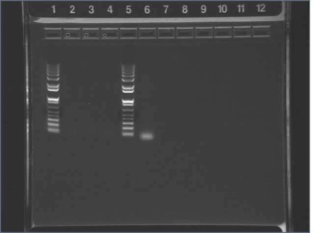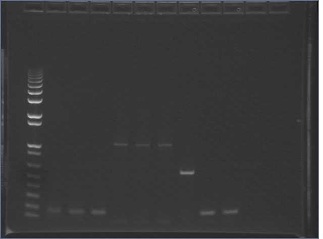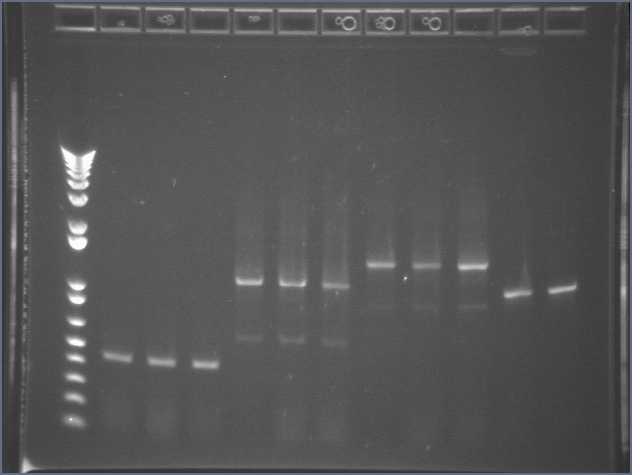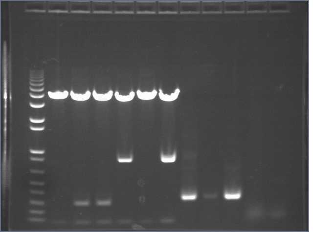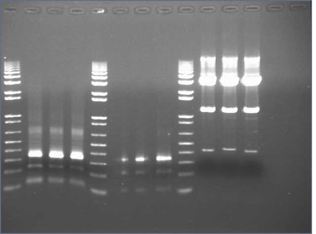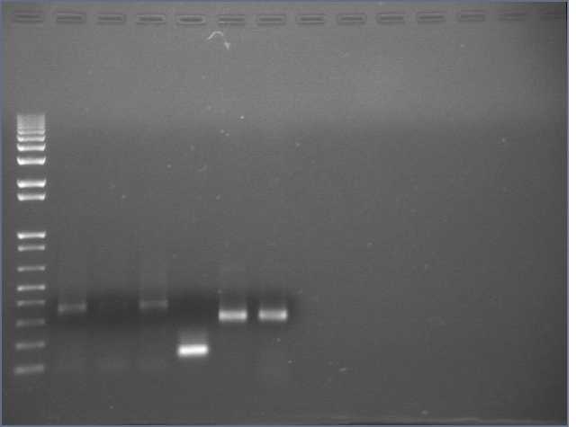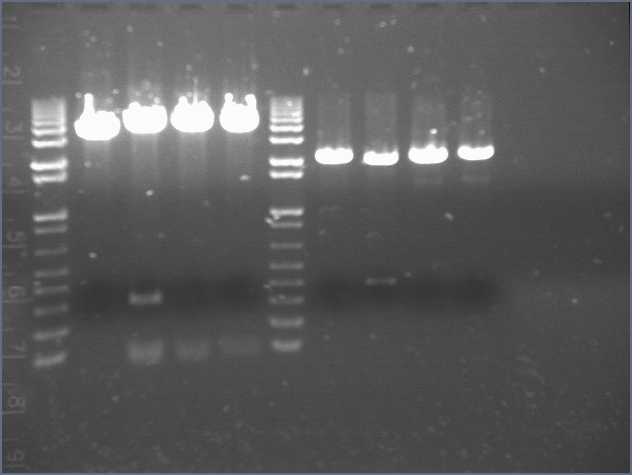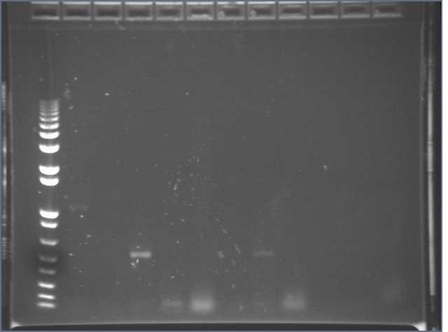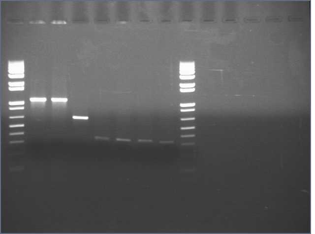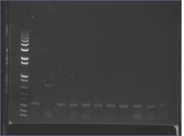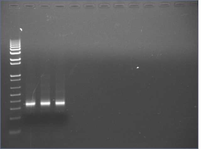 Ug, no bands of the expected 1kb size. There is a uniform band around 100bp, most probably a primer dimer.
