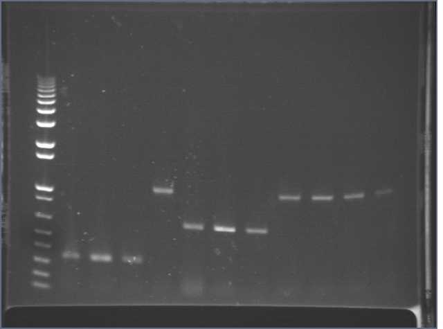 Took 10ul from each PCR and of 1X 1kb+ ladder, mixed with 10ul water, and loaded into 1.2% e-gel.