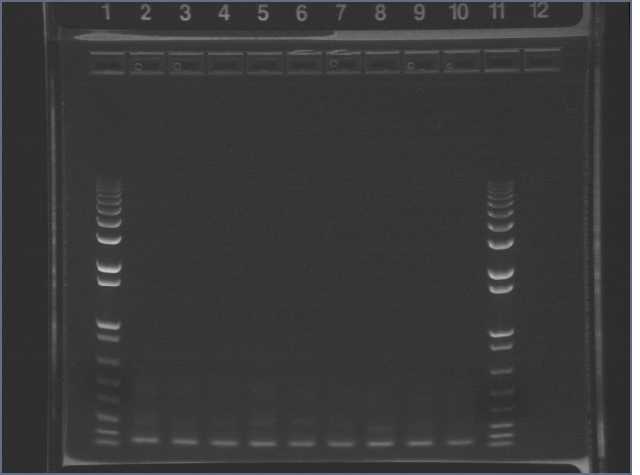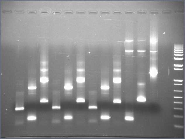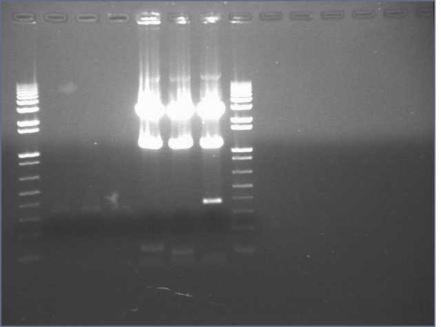 Ran e-gel, loading each well with 10ul PCR mixture/ladder + 10ul water.