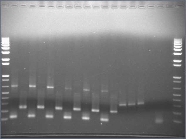 Ran PCRs on 1% 80ml agarose gel, 20 wells.