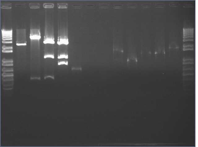 We got no bands, and so performed no gel extraction. We probably had a failed miniprep, evident from the negative number Lewis got from the nanodrop. I guess 2 PE washes is bad.