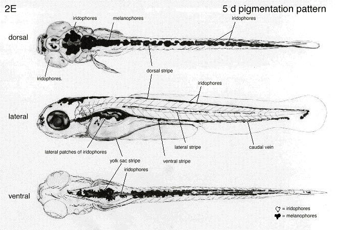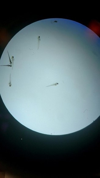 Our embryos that we started with have now begun to grow to their near adult size on day 4. This was evident not only by the large amount of empty hatchlings and casings that were collected, but also by the zebrafish's now new ability of motility as they were seen swimming aimlessly around our petri dish. These embryos are now stages to be in their 36-48 hour year old stage of embryonic development. As we examine closer under the 4x objective, we can see the clear formation of the body and delineating features of tail pigmentation (melanophores). Eyes and eye movement are also seen, along with other new developmental features including the eyes, gills, heart, pectoral fin, yolk sac, swim bladder, and the mouth. When accessing general movement, we used an external stimuli (i.e. suction bulb) to initiate the startle reflex which is highly intact.