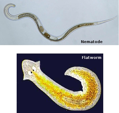 The slender, and semi-transparent body and shape of the Planaria allows this organism to seemingly glide smoothly and evenly over or between environmental surfaces little to no apparent effort powered by cilia. The nematodes is seen with a slightly thinner and greater transparent cross-section allowing it to move faster through water surfaces in a undulating fashion. The last organism in this category, the Annelida has greater percentage of body composition and unlike the both the Planaria and the nematodes, movement involves extending the body, anchoring it to a surface, and contracting body muscles in an almost wavelike contraction/relaxation motion.