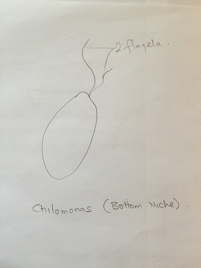 Chilomonas (algae genus): Colorless, cells organ of locomotion is a long whip-like flagella (no cilia), single motile cell, 2 observed locomotor flagella at one end, cell elongated with narrowed posterior. The cell measures 20 ocular spaces using 40X objective lens. Paranema (protozoa): Cell elongated, colorless with a broad or truncate posterior during locomotion. Highly plastic when stationary, often appears to vibrate when in motion. Chlamydomonas (Algae): Cell is greenish, a single motile cell, two observed locomotor with an oval shaped body. The green color suggest photosynthetic activity.it measures around 10μm.