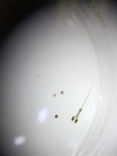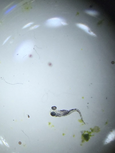 Dead and decomposing Zebrafish reared under constant light observed with a dissecting microscope.