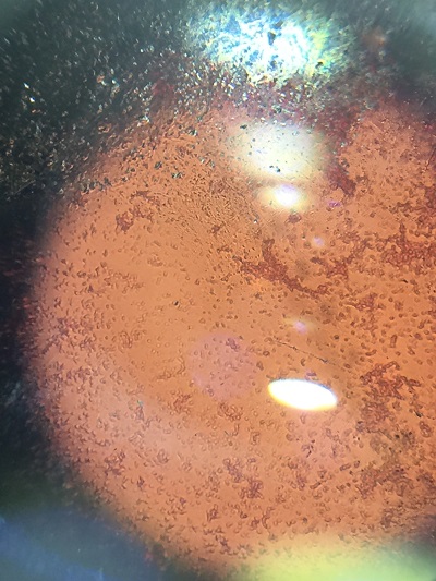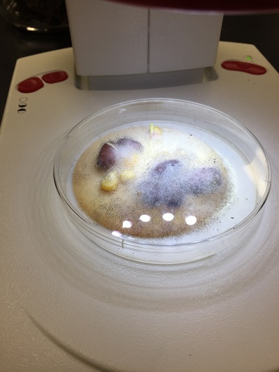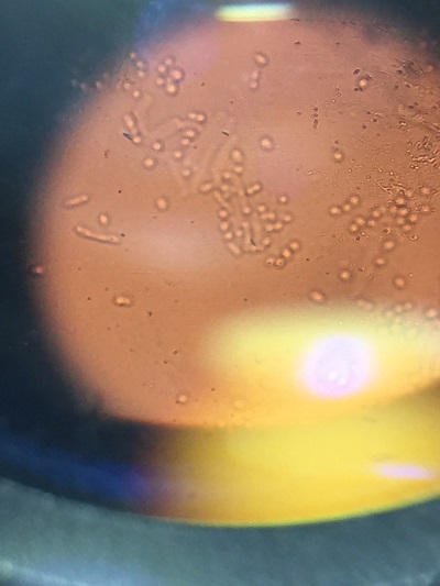 Observations: The hay infusion culture appeared cloudy with a pungent smell. The hay infusion had changed color to light brown with three distinct layers. Molds were present on top of the liquid. There were no green shoots present. Fine granular-like sediments were seen at the bottom layer.