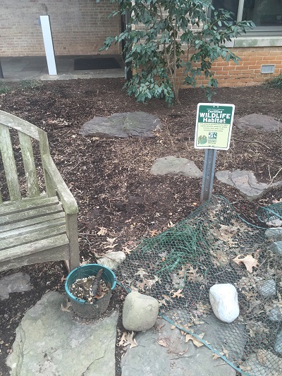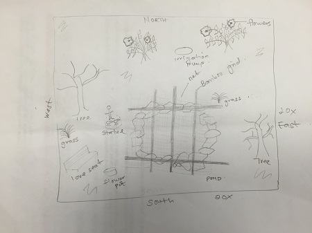 Location: The transect is located in an area behind the AU library close to the student health center. It is a 20 by 20 foot dimension marked with four Popsicle sticks with a pond at the center.