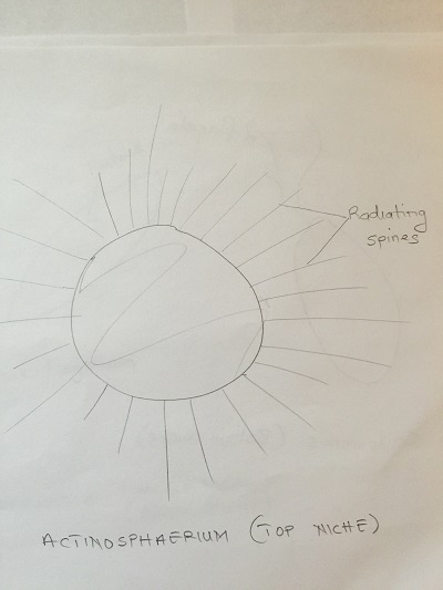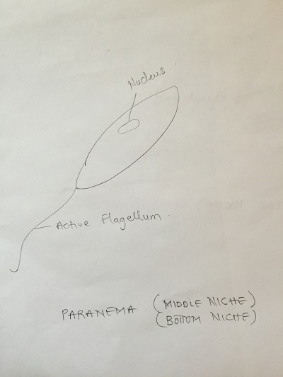 Paranema: Cell elongated, colorless with a broad or truncate posterior during locomotion. Highly plastic when stationary, often appears to vibrate when in motion. Amoeba: Small, creeps using pseudopodia and has a single disc shaped nucleus. Actinosphaerium: Colorless organism sliding slowing without apparent motion, spherical shaped with radiating spines.