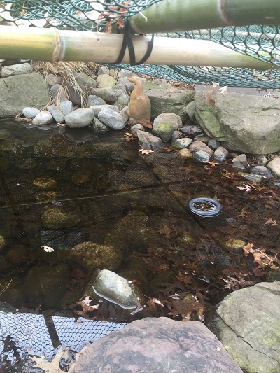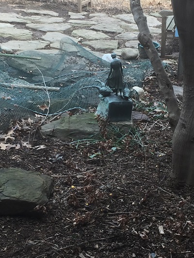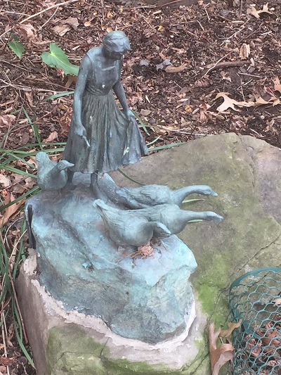 6.	Two statues ( Duck statue in the pond and a woman with three birds at her feet on land)