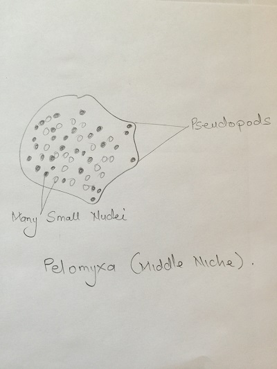 Colpidium: Small body, oval shaped and covered in cilia. Fast swimmer. Paranema: Cell elongated, colorless with a broad or truncate posterior during locomotion. Highly plastic when stationary, often appears to vibrate when in motion. Pelomyxa: large, creeps using pseudopodia, many (100s) of small nuclei.