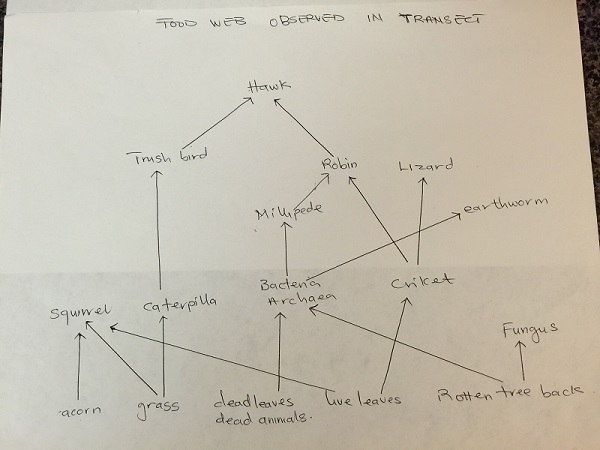 Purpose: To identify, organize and classify vertebrates starting with phylum through species. To construct a food web based on all the groups of organism observed on transects. To describe the biotic and abiotic characteristics of transect that benefits each species.