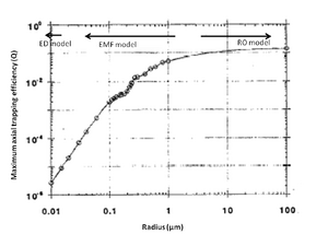 In summary, the RO model is seen to be highly accurate for the prediction of the axial forces and reasonably accurate for prediction in the case of transverse forces in the size regime > 10μm as can be seen in the figure:. The RO model has a reduced accuracy below 10μm; for 1μm diameter beads, the measured Q was comparable for transverse trapping and was lower by nearly a factor of 5 for axial trapping. Fig: shows maximum axial trapping efficiency Q as a function of the radius [15]. RO regime is applicable above 10μm and EMF is below 1μm. The EMF model has some problem in the region >1μm and more work is to be done to increase the accuracy in this region[16].