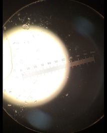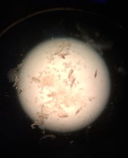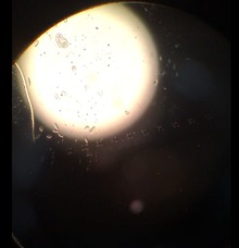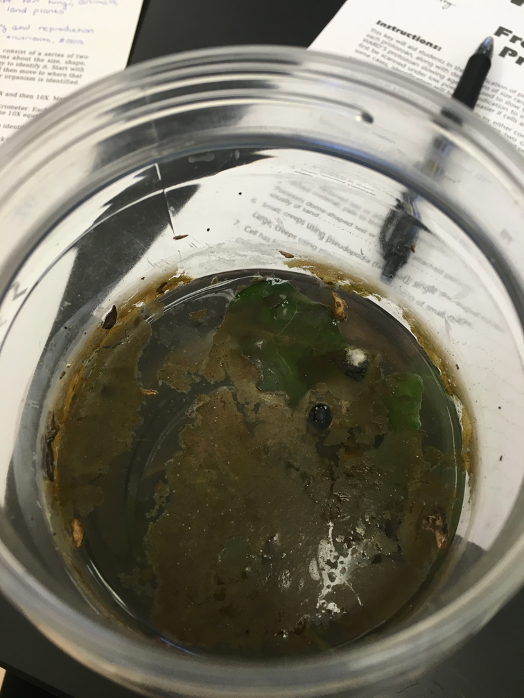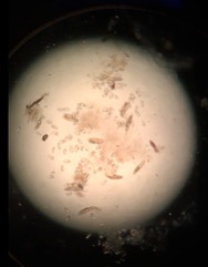 Top of Sample: Many Colpidium and Paramecium with a size of about 70mm. We also saw what could have been an Arcella, however all the organism's features were difficult to distinguish under the microscope. From our sample we can infer that there is most likely a high density of Colpidium and Paramecium living in the top section of the sample and that there is abundant bacteria and algae for these organisms to consume because they are both heterotrophs with an oral groove. This makes sense because there was such an abundance of bacteria, mold, and algae growing on the top of the hay infusion