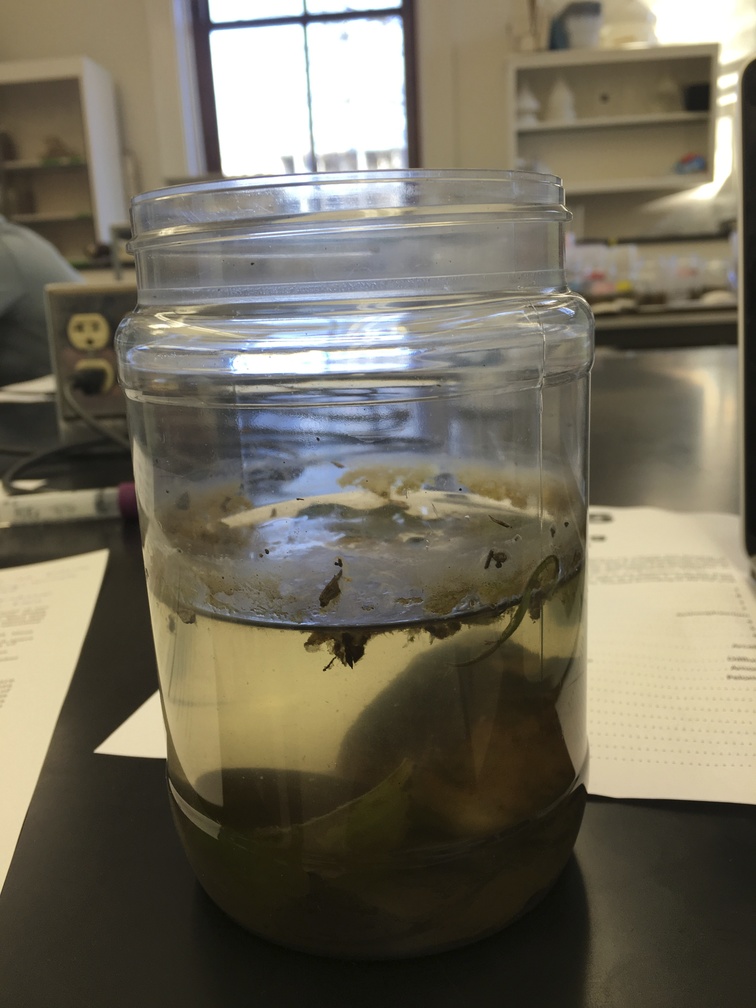 Purpose: To collect soil and plant samples from the transect in order to create a hay infusion. Materials: Mason Jar, soil and plant sample from transect, water, paper and pencil to record organic and inorganic elements of the transect. Methods: Select a transect and spend 30 minutes diagraming and documenting organic and inorganic elements of the transect. After observing the transect, return to the classroom and create a hay infusion by measuring out 10-12 grams of soil and ground vegitation and adding 500mL of deepark water. Att 0.1 grams of dried milk and mix for 10 seconds. Place the jar in the back of the room with the lid off to allow it to breathe. Data: Biotic Life: People: 4 Squirrels: 3 Dead ground bushes: dispersed towards western boundary Flowering shrubs: 4 Trees: 2 (1 dogwood, 1 oak) Little green plants: close to drain in the NW quadrant (small bushes, 2 types mixed in) Green bush: 1 Budding bulbs: more around the drain and also behind the bench to the West Dead bushes: behind North bench Ivy: on the ground at the Northern boundary Green leafy plant: 15 – East boundary Dead plants around the memorial rock: 6 Acorn hats: hundreds dispersed fairly evenly around the transect 1 dead rat deer poop