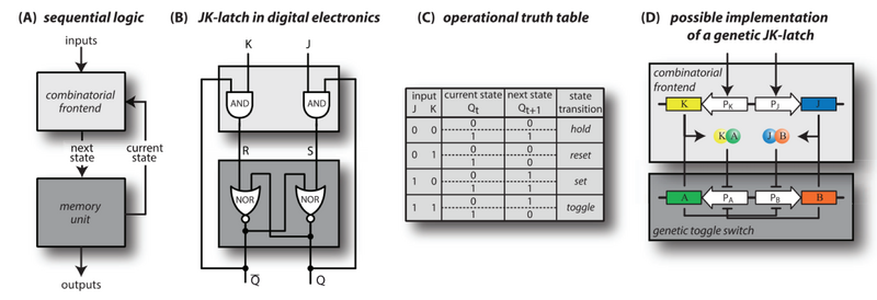 - Genetic toggle switch consists of two mutually repressing genes- it serves as the basis for simple sequential logic.