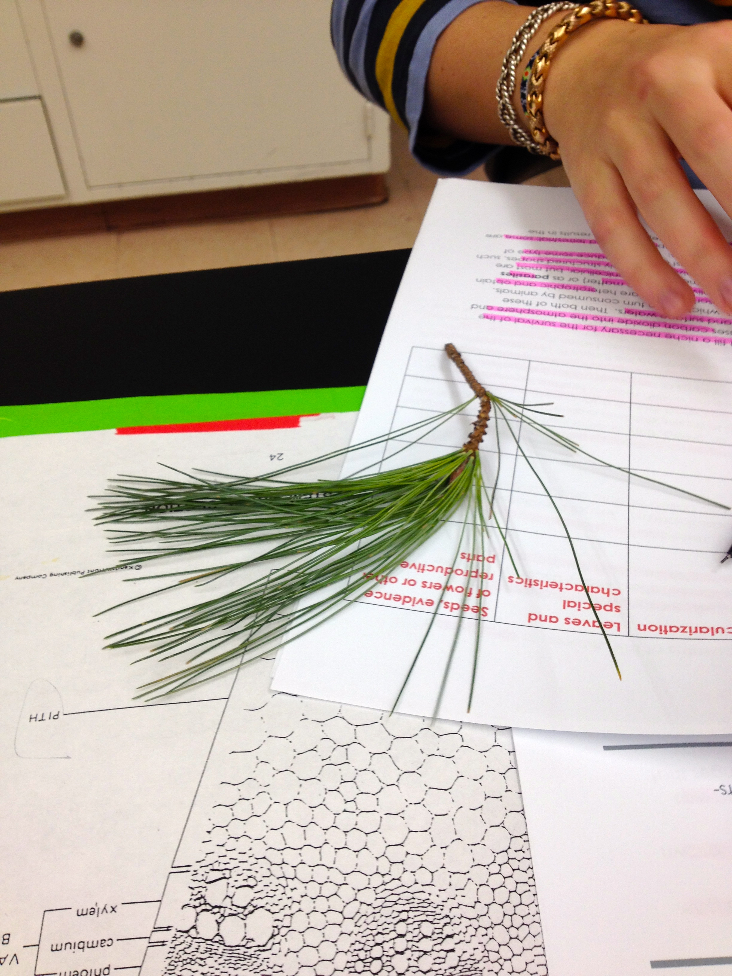 | 1 | Pine tree needle | Tall tree | Long, thin needles; Seeds on the bottom | Gymnosperm, pinecones present on tree | |