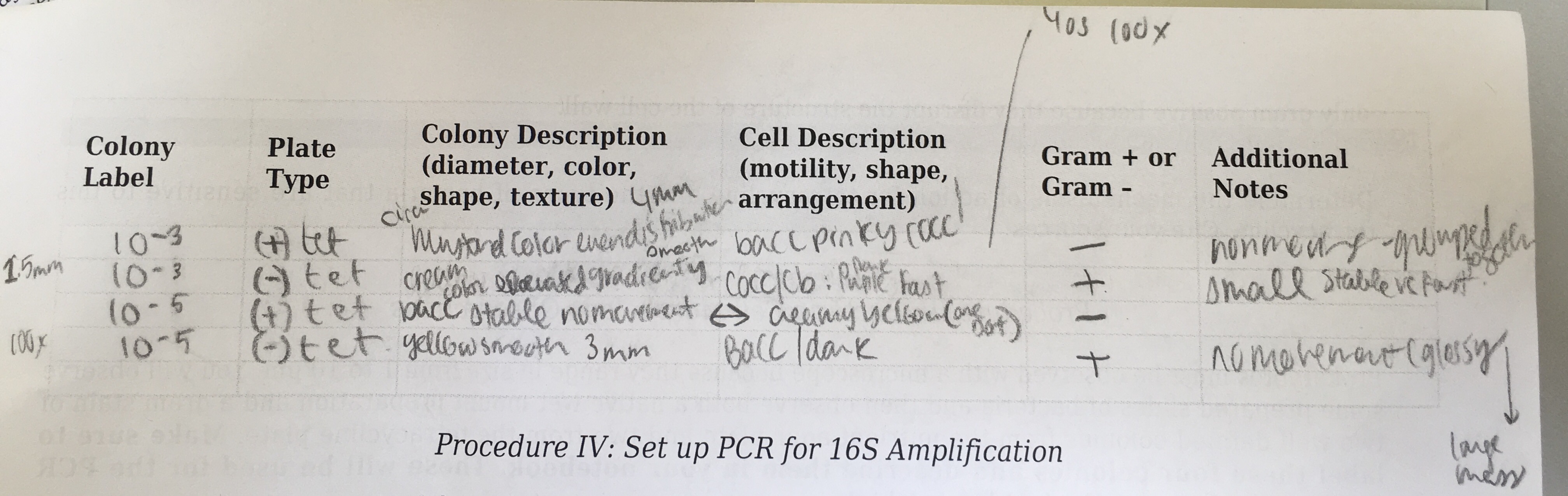 Bacteria Cell Morphology Observations Wet Mounts and Gram Stains were made in order to observe the organisms from the serial dilutions. In order to make a wet mount, we sterilized a loop over a flame to then scoop up a sample of the colony from the agar plates (shown above). After creating a slide they were observed with a microscope. The Gram Stain was created by sterilizing a loop over a flame and scraping samples from the colonies on the agar plates and placing water on the slides. Afterwards, the water was evaporated by putting the slide over the flame from the Bunsen burner. Crystal violet was then placed on the slide for one minute and rinsed off with water. Iodine mordant was then placed on the side for one minute and rinsed off with water. To clean the stain, rubbing alcohol washed the slide for 10-20 seconds and then rinsed. Safranin stain was placed on the slide for 20-30 seconds and then rinsed with water. After blotting the slide with the kimwipe, the slide was ready to be viewed under the microscope. Below is the wet mount microscope pictures, a table describing not only the colony description of four of the plates that showed the most activity, but also the cell description after being observed under the microscope along with pictures from the microscope.
