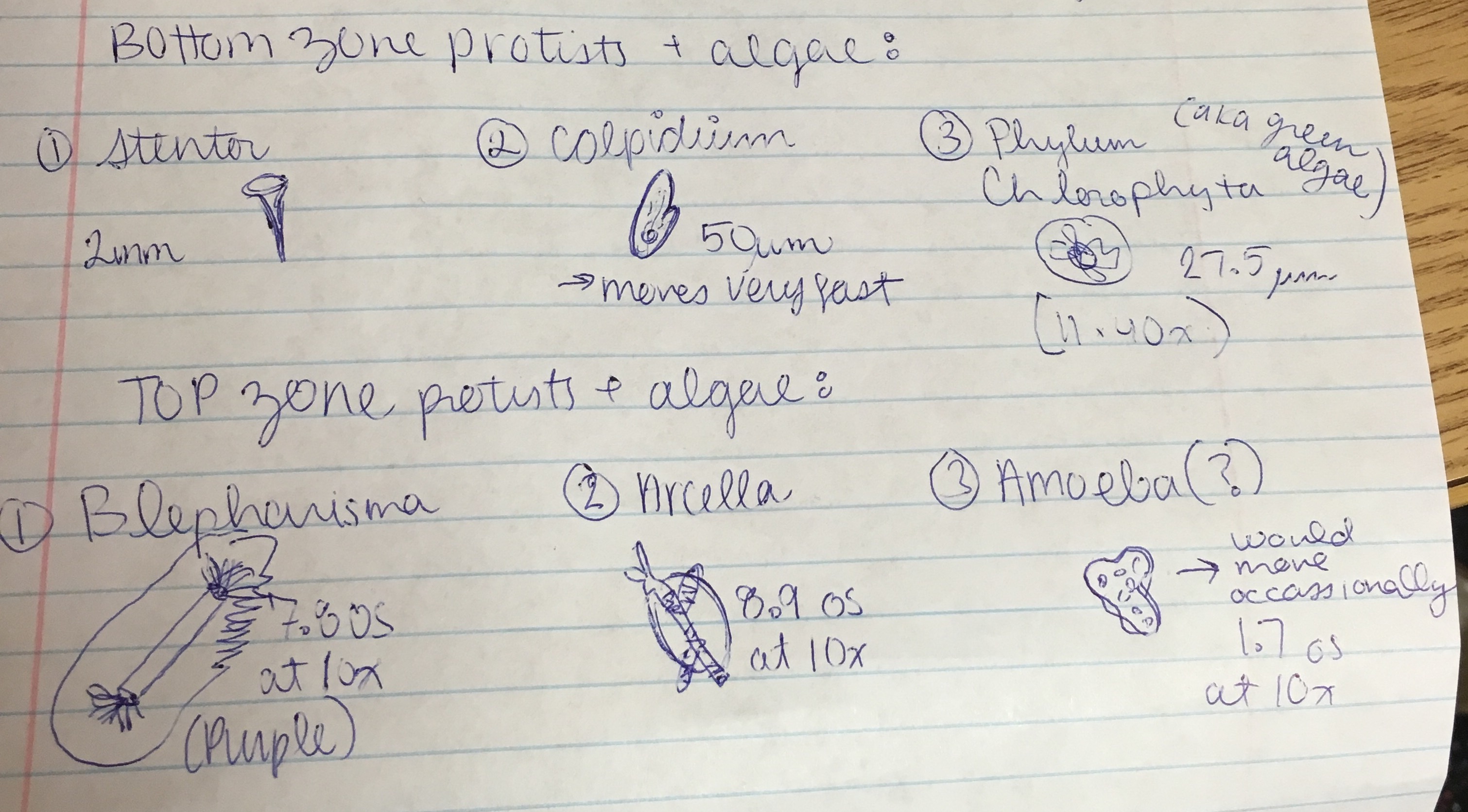 After a week, my lab partners and I observed our Hay Infusion. It was not as diluted as other groups' jars; it contained a very dark brown color. However, similar to many other groups, our jar had a very foul smell. The dilution itself consisted of 10.87 g of samples from our Transect, 0.1 g of dried milk, and 500 mL of DeerPark water. We then took samples from the Hay Infusion itself in order to observe any protists or algae present under a microscope. The layers we chose to pull our samples from in order to make wet mounts were the bottom later and the top later since they would seem to have very different organisms. Using the dichotomous key, we were able to identify a few of the organisms we saw through the microscope. The organisms we found in the bottom zone consisted of Stentor, Colpidium, and Phylum chlorophyta (green algae). In the top zone, Blepharisma, Arcella, and Amoeba were found. The Stentor was a bluish green color and appeared to having an elongated, trumpeted body shape. The Colpidium was caught moving on video. Moving fast across the slide, Colpidium had a round shaped, tiny body with a hook like mouth. The green algae was similar to an Arcella in the round shape, however, it was noticeably green and did not have any globs around it or the brown color like the Arcella we identified in the top zone. Blepharisma appeared as the color purple from the slide and is quite similar to the Colpidium in shape. Lastly, we found an Amoeba that would move occasionally but almost "creeped" across the slide. The size of the Amoeba was not big whatsoever. At the end of lab, we prepared and plated Serial Dilutions for next week's lab from the Hay Infusion. We took samples from the Hay Infusion and pipetted them into sterile broth, which had the dilutions of 10^-2, 10^-4, 10^-6, and 10^-8. Afterwards, we micropipetted the Culture onto four nutrient agar plates and four nutrient agar plus tetracycline plates, which all had different dilutions (i.e. 10^-3, 10^-5, 10^-7, and 10^-9). We did this so that in next week's lab we will be able to see the bacteria from the Hay Infusion divide to form colonies on the agar plates.