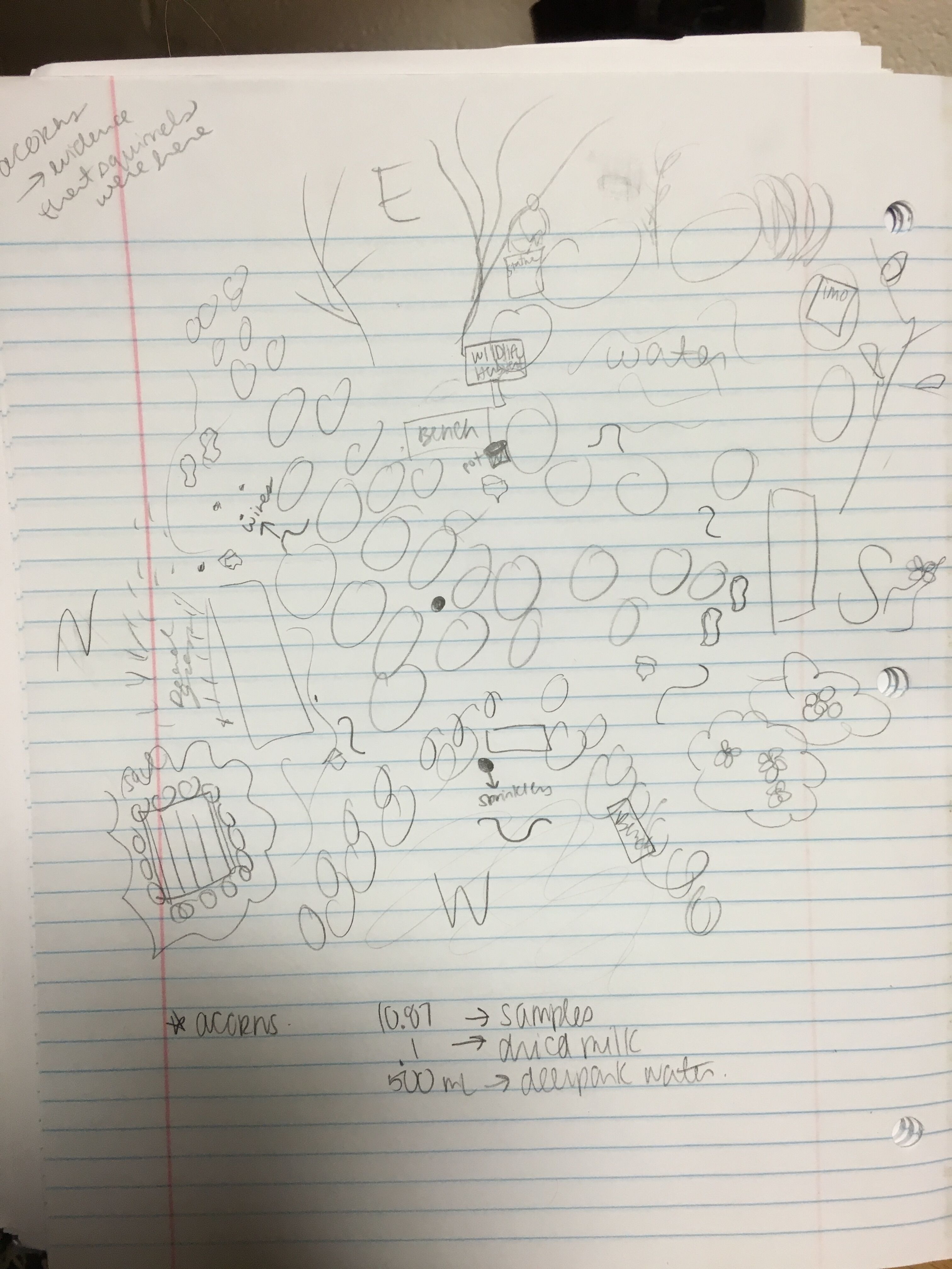 After observing the transect, an aerial drawing was made to replicate such observations. In addition, samples (i.e. rocks, leaves, acorns, twigs, flowers, grass) from the transect itself were collected and taken back to the lab to conduct a Hay Infusion. Along with the 10.87 g sample, 0.1 g of dried milk and 500 mL of DeerPark water were combined in order to perform the Hay Infusion, which was shaken and left in the lab with the lid off over the course of a week.
