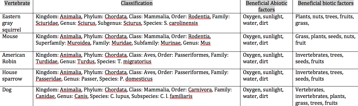 In this lab, the Berlese Funnel was used to look at invertebrates. The liquid was poured onto a petri dish and observed under a microscope. Using a key, 5 different invertebrates were identified and their length was recorded as well as their description and number in shape. In the next class, the transect was revisited to examine 5 vertebrates, two of which were birds. The vertebrates were classified and a food web was constructed.
