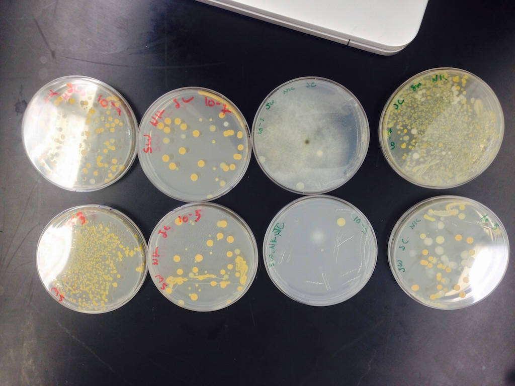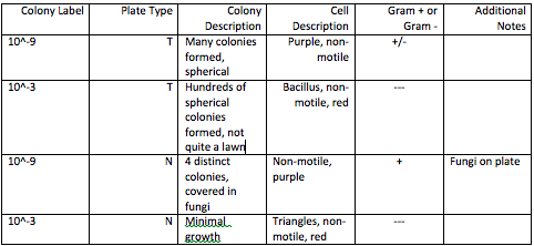 The agar plates from the Hay Infusion were collected and observed, noting signs of bacteria growth through colonies as well as lawns. If colonies were scarce enough, they were counted and recorded in Table 1 below (see Results). Next, the gram stains were prepared, using 2 samples from the nutrient only agar plate, and 2 samples from the Tetracycline containing plates. Individual plastic loops were then used to scrape a piece of growth from the agar plate and transfer it onto a slide containing a drop of water. On the underside of the slide, the plate type (T or N, 10^__) was recorded, and a small circle where the bacteria was placed was drawn. The bunson burner was ignited and each slide was carefully passed through the flame until it was heat fixed, indicated by the water drop vaporizing and the bacteria achieving a fluorescent tint. Each slide was then stained with crystal violet for a minute, followed by a water rinse. This procedure was replicated again, this time with Gram's iodine mordant. The slides were then decolorized using 95% alcohol for 10-20 seconds, rinsed, and stained with safranin for another 20-30 seconds. The samples were then air-dried and placed in the microscope. As they were analyzed, bacteria sightings were recorded, making note of cell characteristics as well as gram positivity or negativity, indicated by the present of crystal violet within the cell walls. Finally, PCR reactions were set up, using 2 colonies (one tetracycline, one nutrient agar only) for the samples. Loops were used again to add a colony from the agar to a sterile tube containing the master mix and specially designed primers. The tubes were then labeled and placed in the PCR machine until next lab.