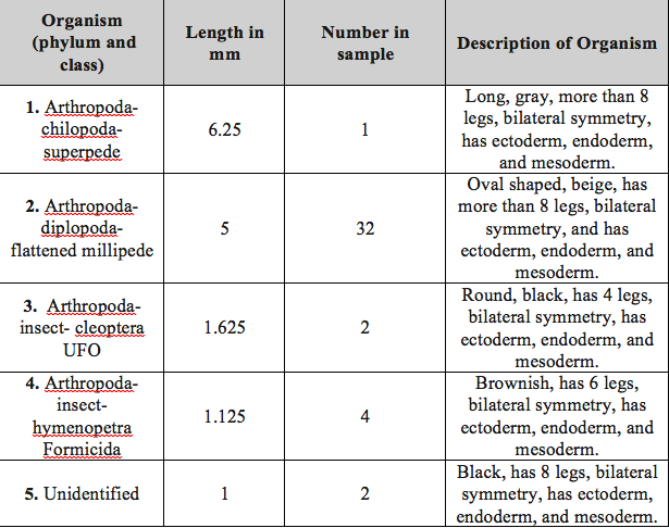 This lab looked at several kinds of invertebrates. Of the ones observed, the Arthropoda Diplopoda was the largest (see Table 1) and the Arthropoda Chilopoda was the smallest. Furthermore, the millipedes were most present in the leaf litter. As the vertebrates present in this community were observed, it became possible to see the trophic levels, with the larger animals representing the uppermost levels. Furthermore, as these organisms interact with each other and share resources within the transect, a carrying capacity is reached. If there are too many species within the community competing for the same resources, the carrying capacity can be reached and natural selection will occur. As part of this, some organisms will die while others will reproduce and evolve.