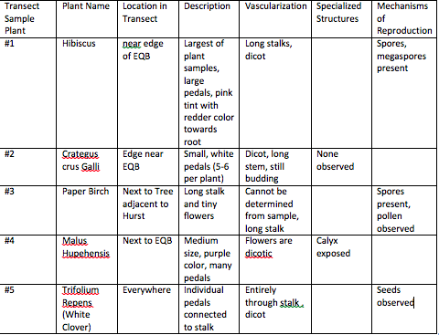 As the results indicate above, there is quite a bit of variability of plant life within our transect. The Hibiscus, for example, was the largest of the samples, and as a result more of the plant characteristics could be observed. The Hibiscus utilizes many large stems to supply the plant with water and nutrients. In addition, the spores and megapores, methods of reproduction, were observed within the middle of the flowers. Contrastingly, the Crategus crus Galli, had smaller, white flowers, many of which were still budding. These plants appear to be dicotic, a characteristic observed among all of the samples. Interestingly, spores and pollen were observed on the Paper Birch, a surprise given the plants' very small vertical nature. For many of the plants, it was difficult to locate specific parts of the cell without observing a cross section. However, within the Malus Hupehensis, the calyx, an upper part of the stalk, was noted. For each plant, many of leaves were oval green shaped. After the plants were observed, the Burlese Funnel was set up for next lab.