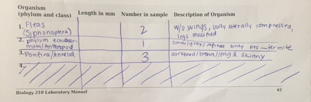 Conclusion: The size range of the samples were not able to be accurately concluded due to errors involving the microscope. The organism identified in the leaf litter that was the most common was the Annelid sample. It can also be concluded that the organisms identified from the leaf litter under the microscope, and that there was great diversity within the organisms.