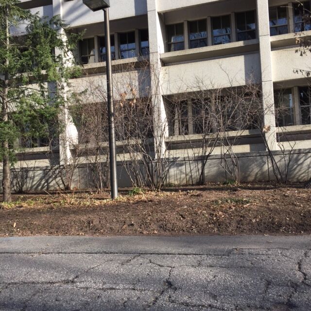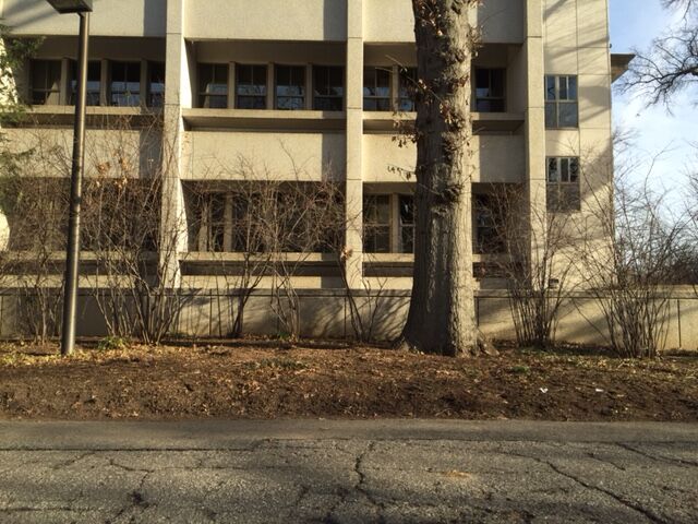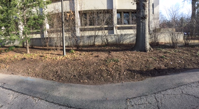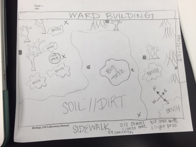 General description: The transect is located on the north eastern end of campus. It is skirted by a sidewalk on 2 of its ends, and borders Ward Building. There is a large patch of dirt that takes up a majority of the transect space. There are several small trees, bushes, and sprinkler systems scattered across the space. There is a large, tall tree in the center of the transect.