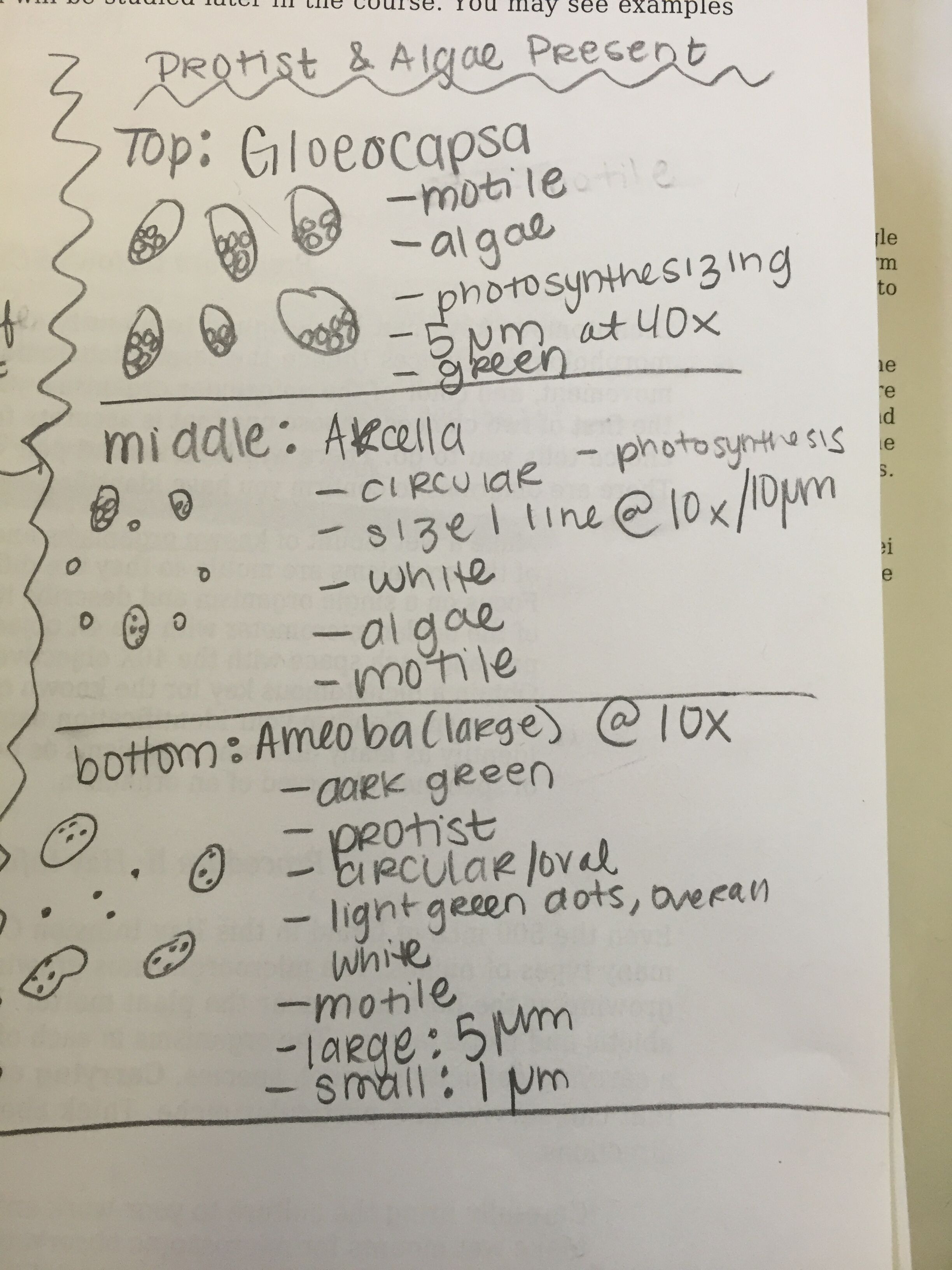 The protists and the algae present include the gloeocapsa which are motile algae that use photosynthesis for their nutrients. They are 5 micrometers at 40x, and are green. The gloeocapsa were found at the top of the hay infusion. In the middle of the hay infusion Arcella was found. Arcella are circular, white motile algae. The arcella uses photosynthesis as well, and was size 1 line at 10x or 10 micrometers. At the bottom section of the hay infusion were amoeba. Amoeba are large, dark green motile circular protists. They were measured to be 5 micrometers at 10x.