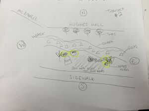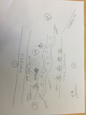 The purpose of this lab was to take a closer look at the biological life around us here at AU. While we study biology, it is important to understand the biological life we interact with each day. This semester, each group will examine a select 20x20 transect located on campus. We had transect #2 which is located by the Amphitheater and Hughes/McDowell Hall. There is a creek, many rocks, bushes, and trees. Below are images and a diagram of the transect. For this week's activity, we collected samples of all elements found in the transect to make a Hay Infusion Culture in lab. We also took notes to describe the biotic and abiotic components of the transect.