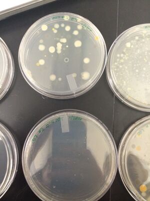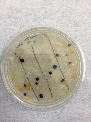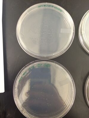 Based on the table above and the images of the plates below, we saw that for the previously mentioned plates, there was no growth at all. The only plates we could compare tet/no tet were the 10^-3 plates and we saw that the growth looked slightly different. The colonies on the plate with tet were larger, more spread out, and brighter in color whereas the colonies on the plate without tet were smaller and covered more of the plate. Neither of these was quite enough to be a lawn. The differences in colony type could indicate that the antibiotic did not allow for as many smaller colonies to grow as we saw with the plate without tet. As seen in the table above, there were significantly fewer colonies on the plate with tet than on the plate without tet. There appeared to be presence of some fungi on each of the plates where there was growth.
