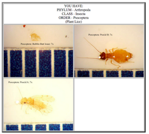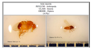 The purpose of this lab was to examine another category of life found in our transects: invertebrates. Just like our plant lab last week, if we are able to better understand what is living in our transect, we can get a better picture of the ecosystem of the transect as a whole. Last week we prepared a Berlese Funnel to collect invertebrates. Another group actually dismounted our tube of 50:50 ethanol/water solution, so they had taken some of our sample. Also during this lab we were able to observe various Acoelomates, Pseudocoelomates, and Coelomates with the dissecting scope and various arthropods that were in large glass jars. However, most of today's lab was focused on identifying the invertebrates from our transect.