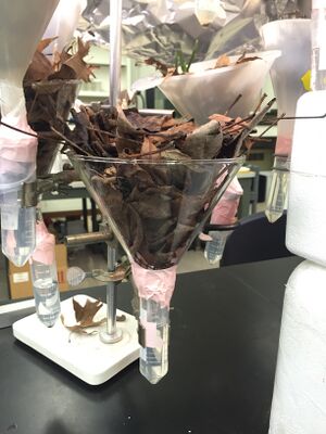To set up the Berlese Funnel for next week's lab, we took a 50 ml conical tube and poured 25 ml of the 50:50 ethanol/water solution. We cut out a piece of screening material and put it in the bottom of the funnel and taped the sides so it did not move. Then we put the leaf litter on top of the funnel and set it all on a ring stand. We taped the funnel and tube together and placed it under a 40 watt lamp to be observed next week.
