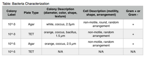 We used colony morphology to help determine the type of bacteria growing on our plates. We counted the colonies on each plate, and made sure we divided by 100 to keep the units the same (colonies/um) since we made the cultures with 100 μL.