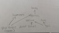 Many different species of birds inhabit the transect, especially in the pine tree, such as the ones listed above. Squirrels benefit from pine cones as a source of food. Squirrels are a source of food for the larger birds that inhabit the pine tree. In the web, humans can benefit from pine trees by using them as lumber for construction or decoration for the Christmas holiday. Bacteria inhabit dead leaves while fungi are decomposers in the soil.