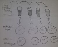 - Obtain four nutiret agar plates and four agar plus tetracycline plates and label them 10-3, 10-5, 10-7, and 10-9.