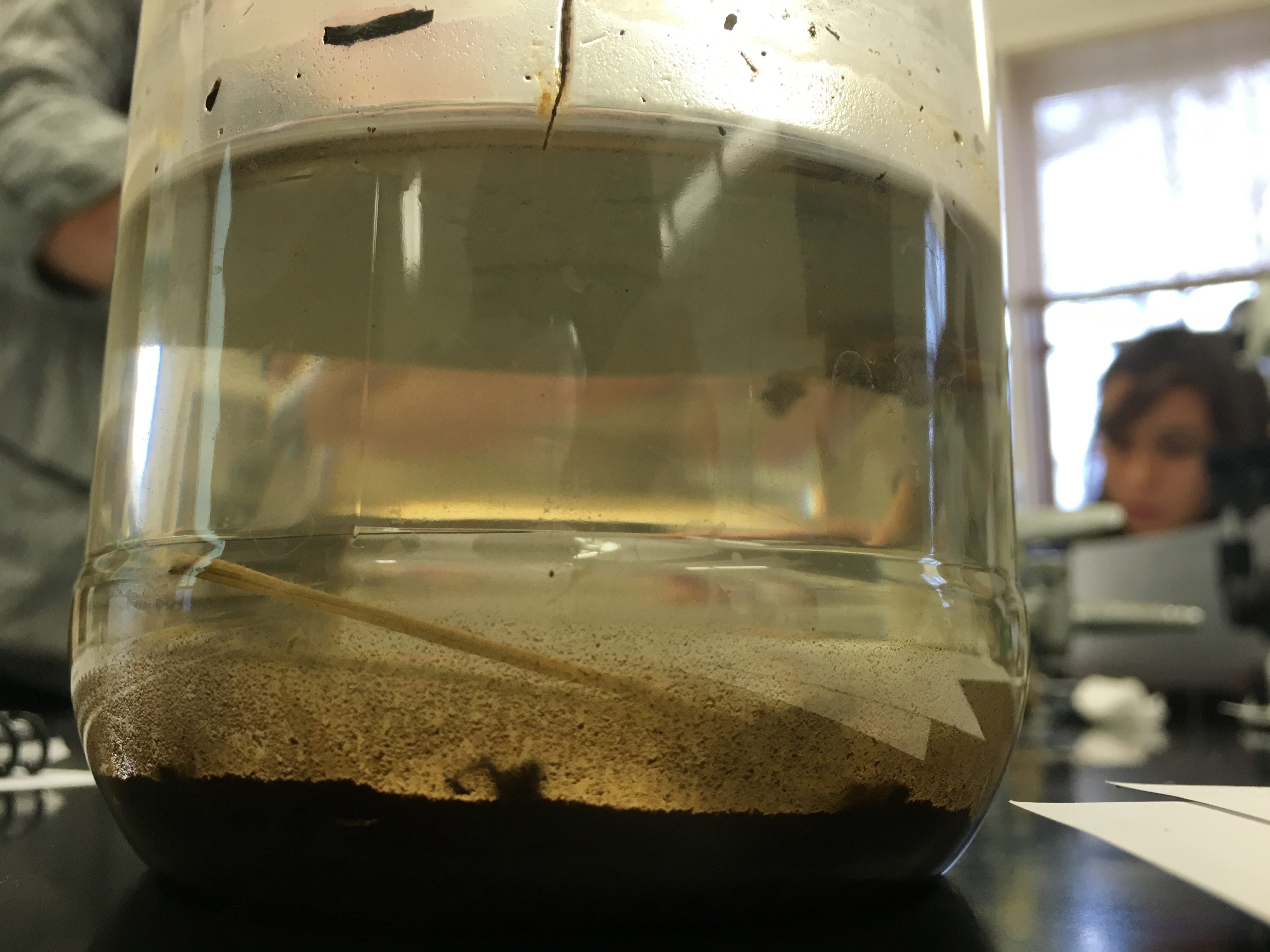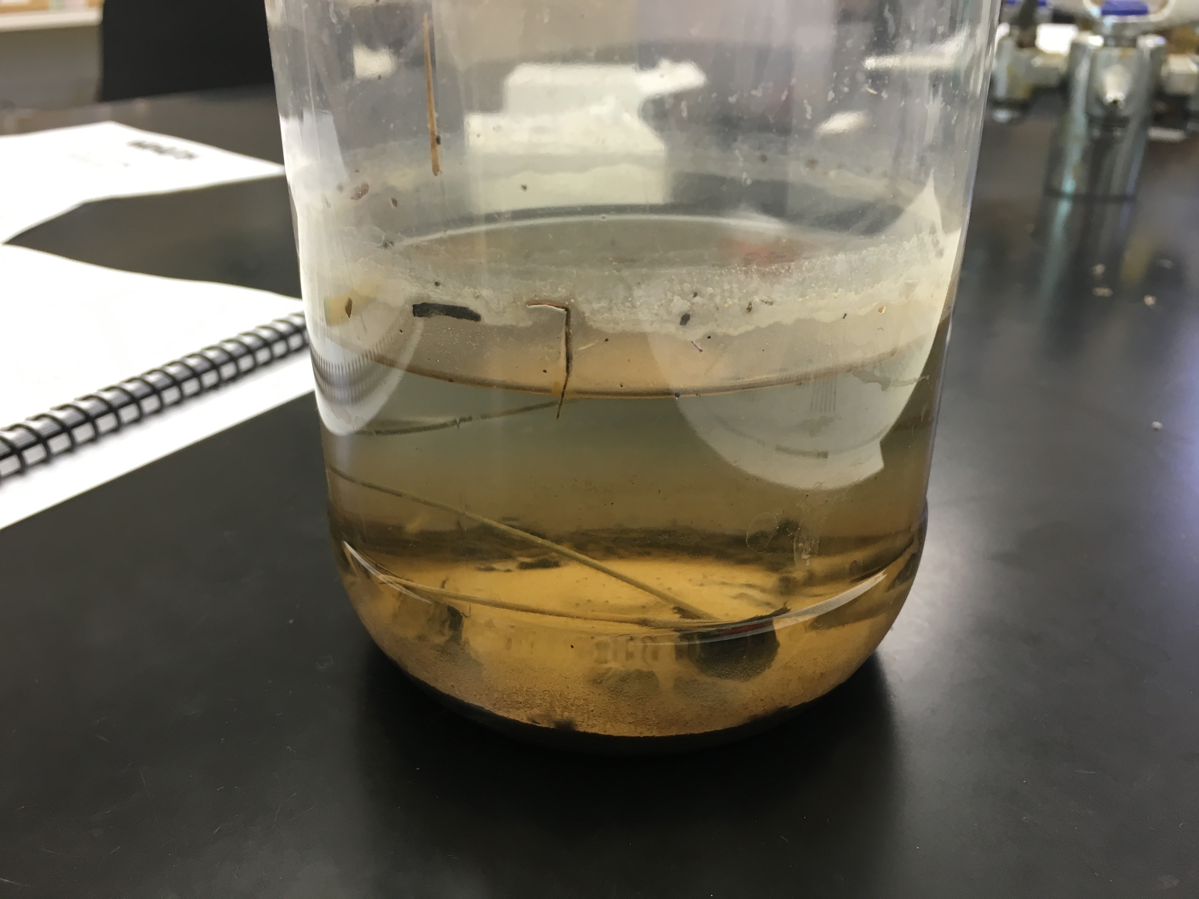 When we opened up our Hay Infusion Culture, surprisingly our culture did not smell bad. In fact, it smelt like fresh soil and natural. At the bottom of our jar was the buildup of dirt and on top was the water. On the top layer, we did not notice any type of mold or green shoots, however there was an apparent thin layer on the top of our water.