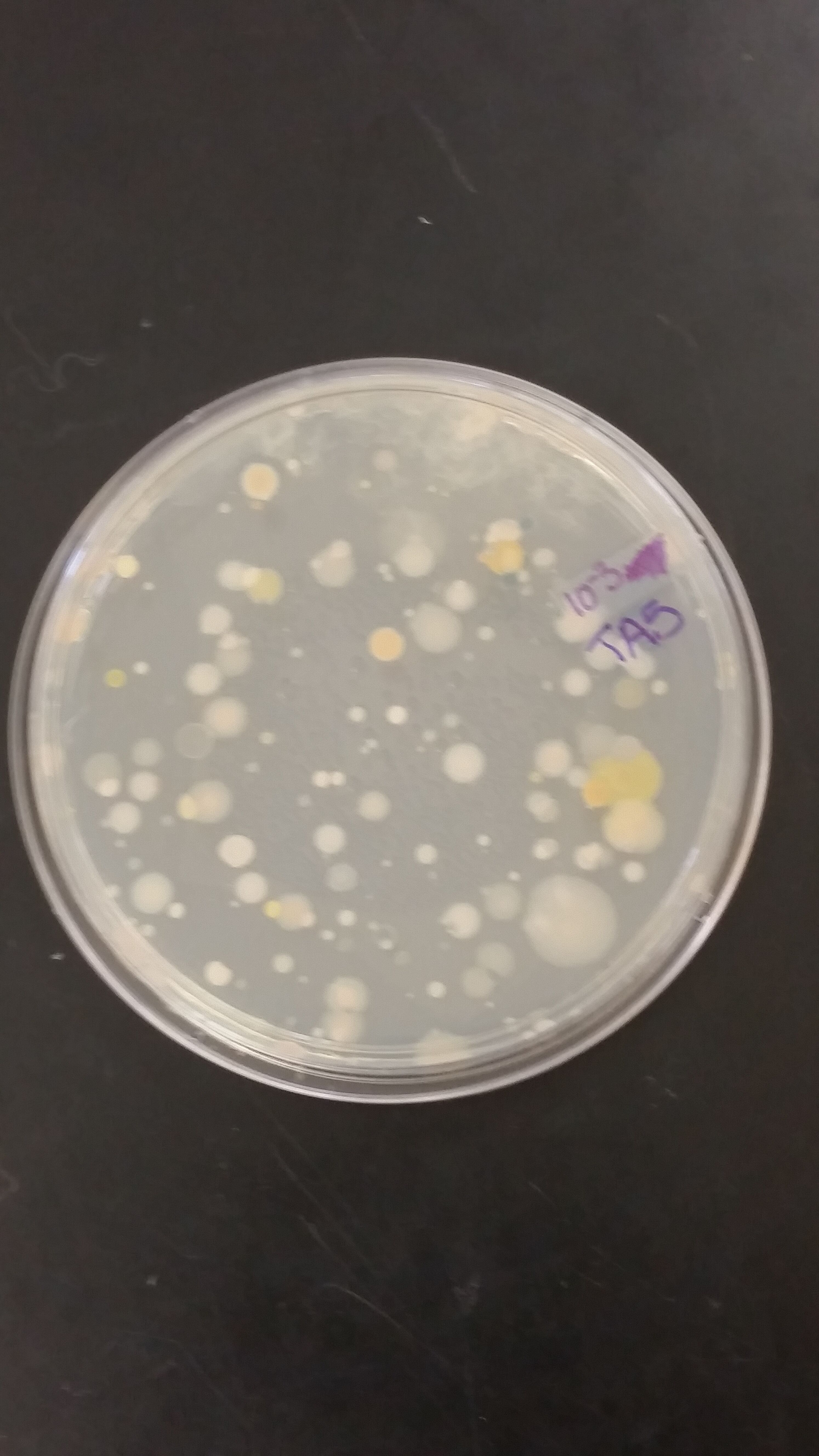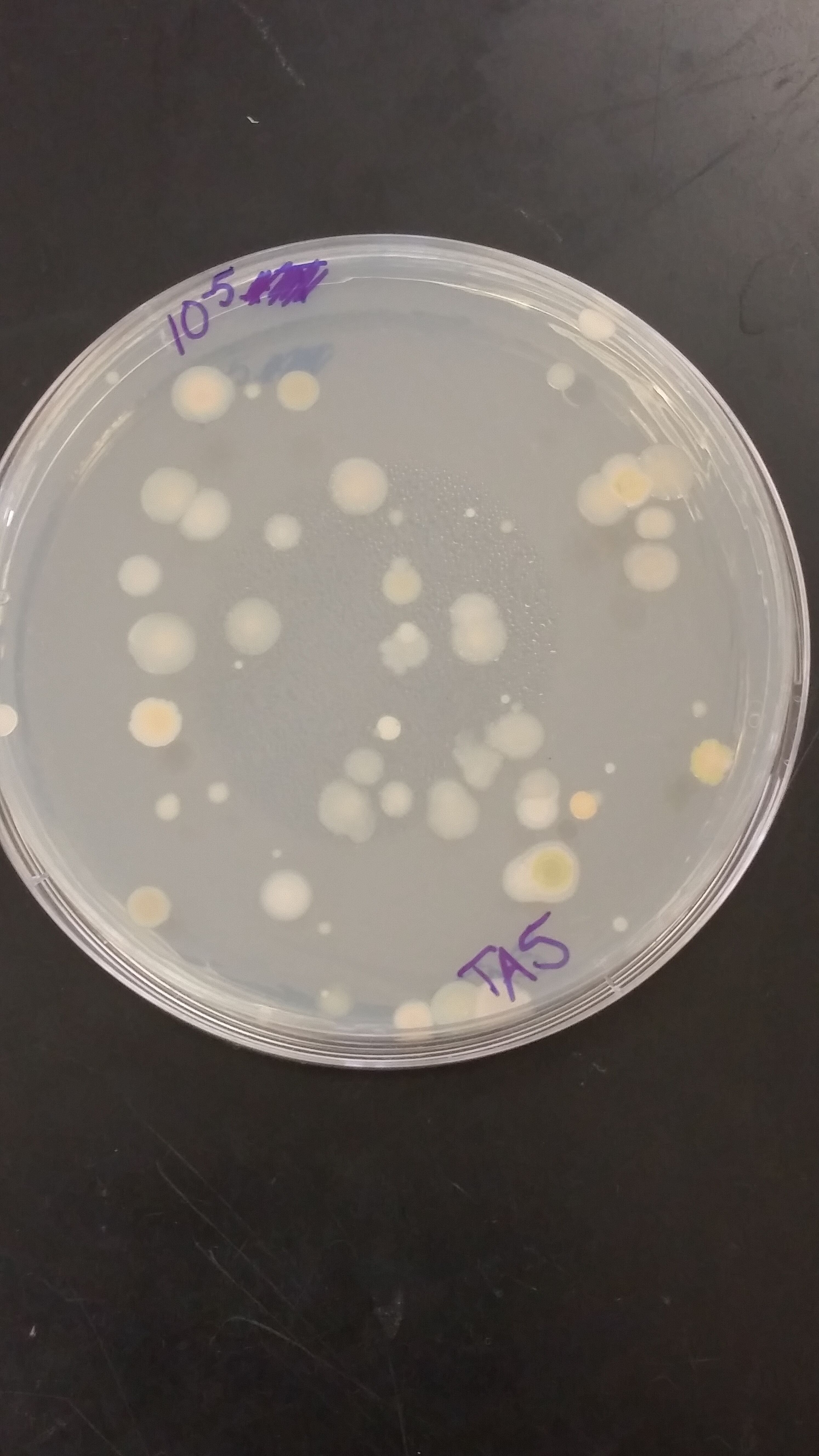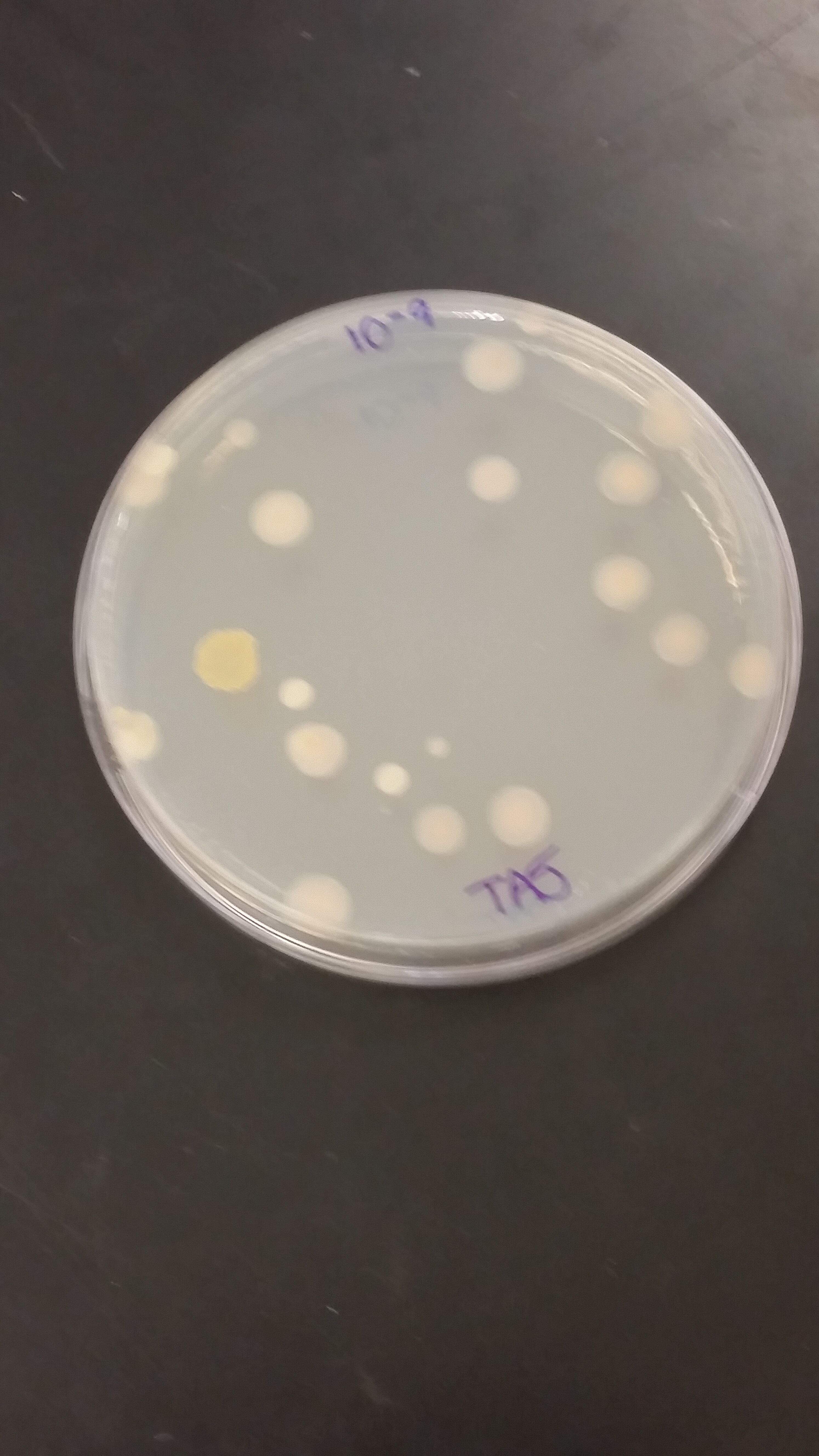 | 10^-5 | Tetra | Flat, White with a tinge of yellow, Coccus, Smooth/Glistening | Coccus, Circular, Motile | Gram - | On this agar plate there was only 1 colony found |