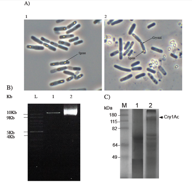 When pHT3101-cry1Ac was introduced in 4Q7, the recombinant bacterium produced crystals in the cytoplasm, readily detected by phase contrast microscopy. (Figure 2A). Recombinant 4Q7 was compared with the wiltype form of Bacillus 4Q7 and the results in fact showed the presence of crystals in the recombinant strain. To further our studies, an agarose gel and a protein gel was performed to verify the gene insert in the recombinant Bacillus 4Q7. The agarose gel was perfomed by running the vector in both, circular an linear form. To linearize the plasmid an enzyme digestion was done with SalI and the results showed in figure 2B confirm the presence of the gene. To verify the presence of the cry protein the SDS PAGE was preformed only in Bacillus thuringiensis 4Q7 and, Bt 4Q7/pHT3101-cry1Ac.The results in supplementary figure 2C show a band corresponding to the cry1AC in the recombinant 4Q7 that prove the presence of the protein in Bt 4Q7/pHT3101-cry1Ac