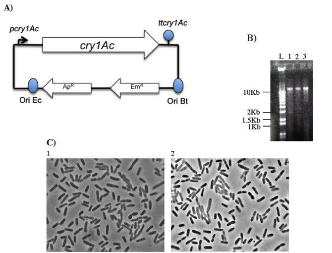 We would like to thank M.S. Karen Stephania González-Ponce for providing us the pHT3101-Cry1AC and Dr. Eleazar Barboza Corona for the Bacillus thuringiensis Serovar Israelensis Strain 4Q7 and for letting us use the Quantity One program fotodocumentador "Gel Doc" (BioRad) and the Axio Imager A.1 Zeiss microscope to analize our results. Special thanks to Dr. Estibaliz Sansinenea for providing us with the article “Genetic manipulation in Bacillus thuringiensis for strain improvement”. And last but not least, we thank Dr. Digpal Singh Gour for his teachings and the support during our project.
