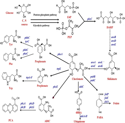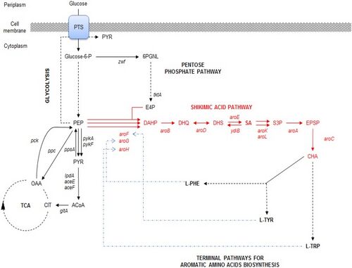 MetabolitesAntiviralsSeasonal Influenza“Seasonal influenza can infect up to 20% of the population. Up to 650000 people die of respiratory diseases linked to seasonal influenza each year and up to 72000 of these deaths occur in the WHO European Region.” [1] In the context of the bioeconomy, the burden of influenza is tremendous in the form of medical care, healthcare utilization and lost working hours. [2] There are four types of influenza viruses with Influenza A and B viruses causing seasonal epidemics of disease. Structure of Influenza Virus and Viral life cycleAlthough the structure of the influenza virus can vary, there are two different glycoprotein spikes embedded on the viral envelope: hemagglutinin (HA) and neuraminidase (NA) proteins. Within the lipid envelope is the influenzas’ genome, organized into eight pieces of single stranded RNA.[3] [4] The viral life cycle can be segmented into the following stages: viral attachment to host cell, viral penetration into host cell, viral uncoating, viral genome replication and transcription, viral translation and assembly followed by viral progeny release. [5] Influenza virus first recognize and bind onto the sialic acid sugars on the surface of the host cell through HA, which triggers a merging of the viral envelope with the host’s endosomal membrane, allowing the viral ribonucleoprotein (RNP) complex which consists of viral RNA segments coated with nucleoprotein and RNA polymerase to enter the host’s cytoplasm through endocytosis. RNPs then enter the host cell nucleus where mRNA of viral origin can be exported and translated. After budding of the influenza virus is complete where mature virions bind on the sialic acid as before through the HA, they detach from the cell surface due to the sialidase activity of the NA protein. The NA protein cleaves terminal sialic acid residues from the cell surface to release progeny virus from the surface of the host cell as well as removes sialic acid residues from the virus envelope itself to prevent viral particle aggregation, enhancing infectivity. Lastly, NA also plays a role in allowing virions to enter respiratory epithelial cells by breaking down mucins in respiratory tract secretions. [6] Shikimic acid and TamifluOseltamivir (sold under Tamiflu) is in a class of medications called neuraminidase inhibitors and aids in preventing and treating influenza A and B. [8] It is ingested in the form of an oral prodrug, oseltamivir phosphate, a compound that is metabolized in the body by hepatic esterase into its pharmacologically active form, oseltamivir carboxylate (OC). It binds to and inhibits the active site of the neuraminidase enzymes that plays a significant role in the release of progeny viruses and enhancement of infectivity, as mentioned above. OC effectively reduces viral replication, limits viral load, drastically reducing influenza symptoms and associated complication. Because of the highly conserved active site of the neuraminidase enzyme, it is effective against all neuraminidase subtypes.[9] ![]() Shikimic acid is an important intermediate for the manufacturing of oseltamivir, along with other pharmaceutical compounds. These include Zeylenone and 3,4-Oxo-isopropylidene-SA that has antiviral, anticancer, antibiotic properties and antithrombotic and anti-inflammatory effects, respectively. [11] Shikimate, the more commonly known anionic form of shikimic acid, [12] is naturally extracted from the pods of Chinese star anise plants; however, inadequate raw feedstocks and the complex extraction that involves a 10-step process that takes approximately 6-8 months to complete have rendered it challenging to meet the worldwide demand for it.[13] Chemical- based synthesis are also commercially unattractive because of environmental concerns.[14]. Therefore, there is an ever -increasing demand for an alternative synthesis method for elevated shikimate production. The shikimate pathway is found in bacteria, fungi, plants and algae and is shown in the diagram below. It begins with the condensation of intermediates of the glycolytic pathway and the pentose phosphate (PP) pathway, phosphoenolpyruvate (PEP) and erythrose-4-phosphate (E4P), respectively. These two pathways are part of the central carbon metabolism (CCM), consisting of enzymatic reactions that convert carbon sources into biomass energy.[15] These two compounds are initially combined to produce 3-deoxy-D-arabino-heptulosonate-7-phosophate (DAHP) by DAHP synthase. In E.coli, there are three DAHP synthase isozymes – aroF, aroG and aroH. Hence the resultant DAHP is converted to shikimate with reactions catalyzed by these enzymes. These three isozymes are feedback inhibited by one of the end products, namely aromatic amino acids- tyrosine, phenylamine and tryptophan.[16] [17] Antivirals - Figure 1. Shows the Interaction between CCM (PP, TCA, Glycolysis) and the shikimate pathway (upper)[18] (lower)[19]