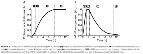 TX-TL ModellingN.B It should be noted that although primary sources are cited below, much of the general understanding stems from the mini review published by Koch et al., 2018[1]. What is TX-TL?Transcription-Translation (TX-TL) modelling extends the standard model of gene expression to cell-free systems. It takes into account, as its name suggests, the shared transcriptional and translational machinery in in-vitro cell-free systems. Typically, TX-TL models are classified as dynamic, deterministic models and hence involve modelling the kinetics of the cell-free system through non-linear ordinary differential equations. This involves breaking down the process of transcription and translation into two similar equations and relating these to the rate of protein production through various parameters, whilst adhering to the various conservation laws outlined below. Since these models use non-linear ODEs they cannot be solved analytically, parameters must either be measured experimentally or estimated using software. Generally, TX-TL models require few external parameters and those that are required generally have clear physical interpretations meaning most can be quantified experimentally. In the papers reviewed below the model parameters were tuned using parameter tuning software alongside real experimental data. Ideally this is the approach we would take in developing our model, however due to the current COVID-19 situation it is unlikely that we will be able to secure sufficient lab time to gather the in-vitro data. One approach could be to test and tune our model based on data which has already been collected for similar metabolites. Why use TX-TL for Cell-Free Systems?In-vivo modelling techniques are designed with several active cellular processes in mind, in cell-free systems many of these processes no longer continue to run. Additionally, several environmental differences exist for example molecular crowding [2], the significantly altered resource distribution [3] and the lack of resource competition with the host. It follows that to accurately model a cell-free system these standard modelling techniques must be adapted to take these environmental differences into account. What do TX-TL Models Predict?Cell-free systems are used for protein production, according to [4] the rate of protein production can be broken down into four phases: 1) Increasing rate of production, 2) Constant rate of production, 3) Decreasing rate of production, 4) Rate of production is zero. And for mRNA production: 1) Increasing concentration, 2) Constant concentration, 3) Decreasing concentration, 4) Concentration close to zero. These phases are summarised in TX-TL - Figure 1. TX-TL - Figure 1. From Koch et al., 2018, Summarises the four phases of protein and mRNA production[1]