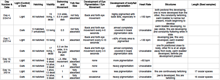 Hypothesis: Based on previous studies, we predict that Zebrafish kept in a dark environment will develop slower than those kept in normal lighting conditions.