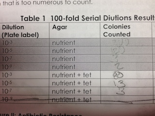 - obtain four nutrient agar and four agar plus tetracycline plates and label one plate from each group 10^-3, 10^-5, 10^-7, 10^-9
