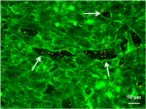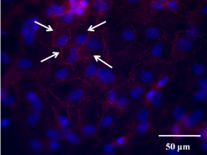 Fig.3 From left to right: HAECs confluent mono-layer; Tight junctions (white arrows) between adjacent HAECs; Platelet adhesion and aggregation on bare scaffold; Platelet adhesion on exposed scaffold (white arrows) in an endothelial mono-layer. No platelet adhesion/aggregation on HAECs mono-layer.
