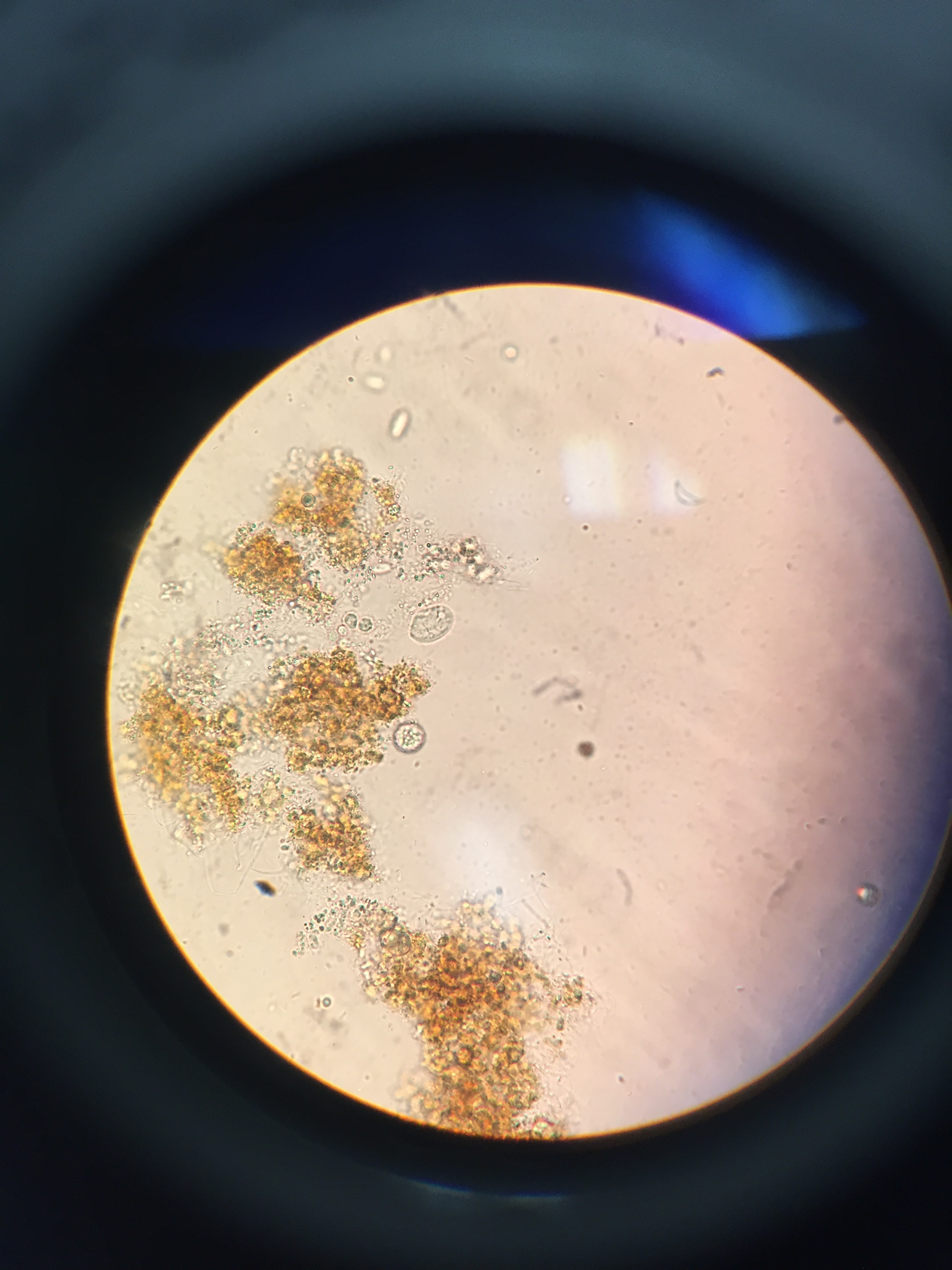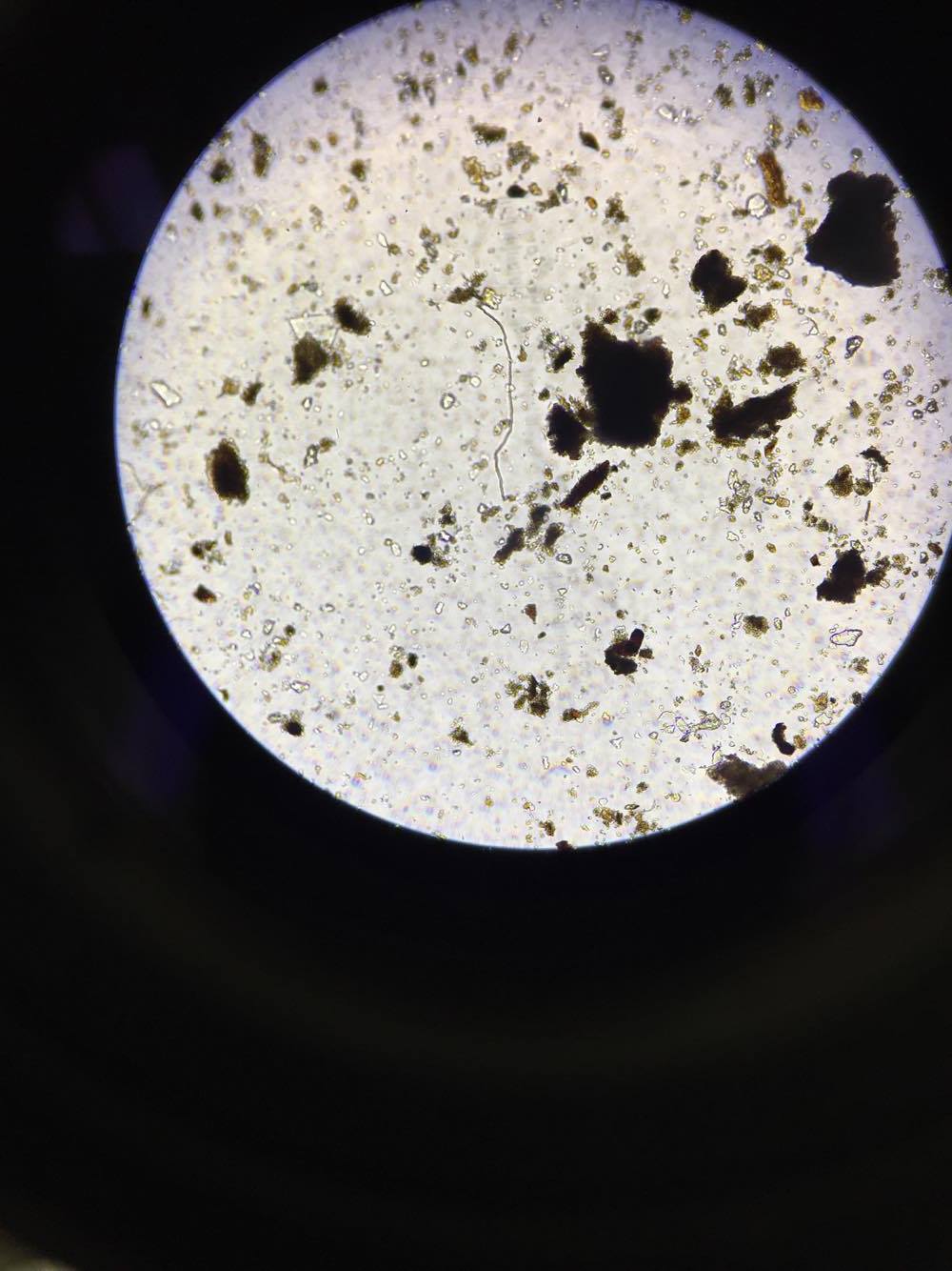 Description of Hay Infusion and Initial Observations: The Hay Infusion culture was filled with fallen leaves, acorns, small pine cones, twigs and smaller branches, and some soil. After adding the deerpark water and the dried milk and waiting one weak, the culture contained a very brown colored solution inside. The collected biotic materials from the transect are distributed unevenly throughout the culture. There was a rather sulfuric or rotten egg like smell in the culture, but also a rather earthy smell. There were no green shoots on top of the liquid, but there appeared to be some mold growth and possibly the beginnings of fungal growth. The mold and fungus will probably grow much more overtime if we let the culture remain.